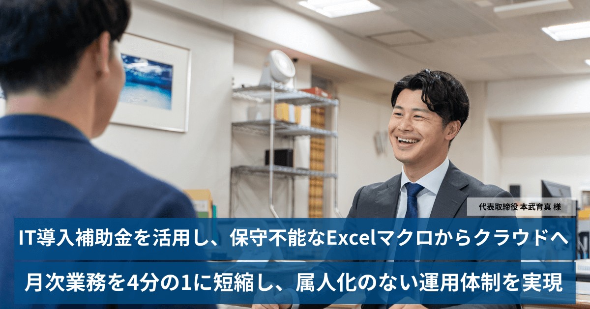 台東区浅草橋・蔵前エリアでマンション管理や賃貸・売買等を行う老舗不動産会社。同社では、長年運用してきた自社システムが複雑化し、事業承継を控えて「業務の継続性」が懸念される状況でした。そこで、組織としての持続可能性を高めるべく、IT導入補助金を活用したシステム刷新を決断。低コストでの導入と業務標準化を実現したその経緯と成果を伺いました。